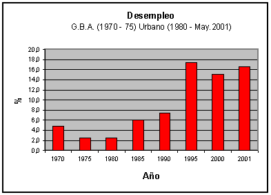 Sin embargo, el modelo económico mostró sus desventajas al considerar el aumento de la tasa de desempleo que subió desde un 7% hasta niveles mayores del 14% , pasando por picos de más del 18%. Esto se muestra en los gráficos siguientes en cuanto al desempleo en el Gran Bs. As y las relaciones entre los índices de precios y la tasa de desempleo.