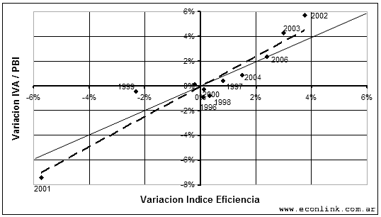 La línea punteada representa la tendencia de la nube de puntos. Si se compara esta con la recta de 45°, se puede ver que la línea de tendencia es mas empinada, indicando que las variaciones en la presión IVA / PBI sin ajuste por Ciclo, son mas grandes que las variaciones del índice de eficiencia. Esto se debe el efecto que produce el ajuste por el Ciclo económico, alisar las variaciones.